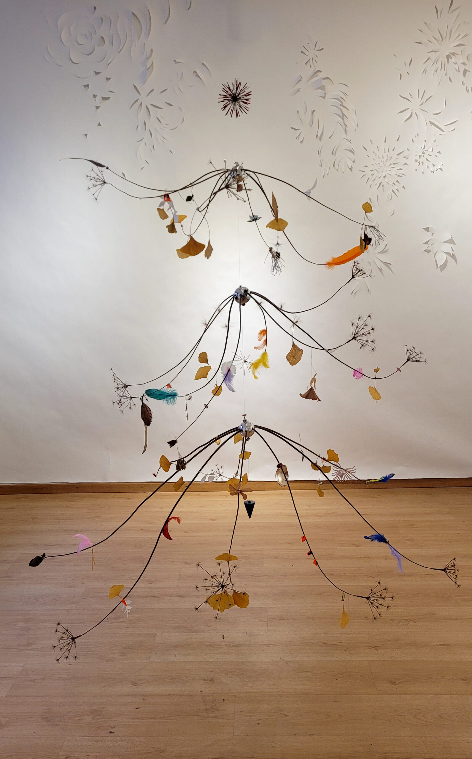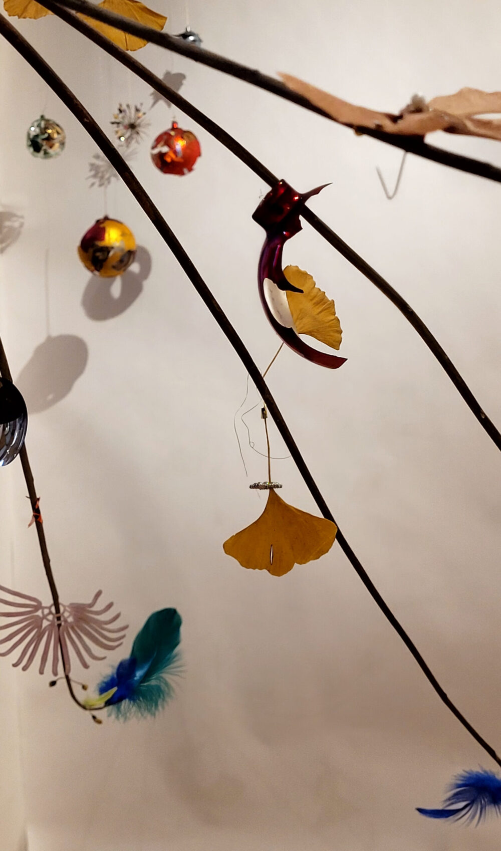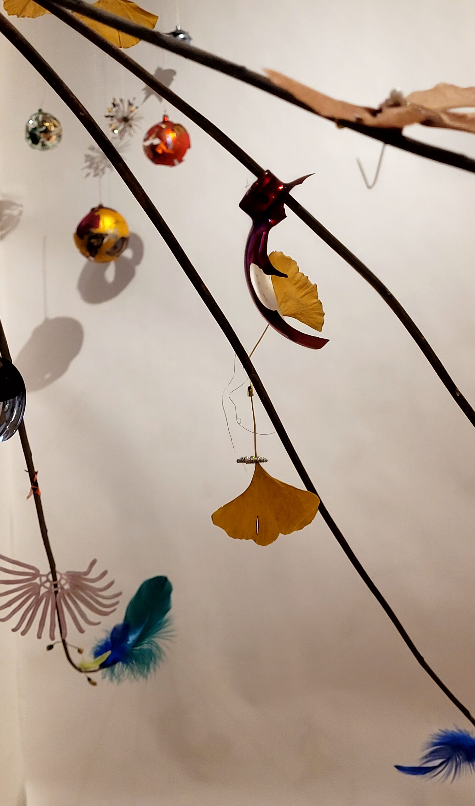 Mobile, végétaux, boules de Noël et matériaux divers