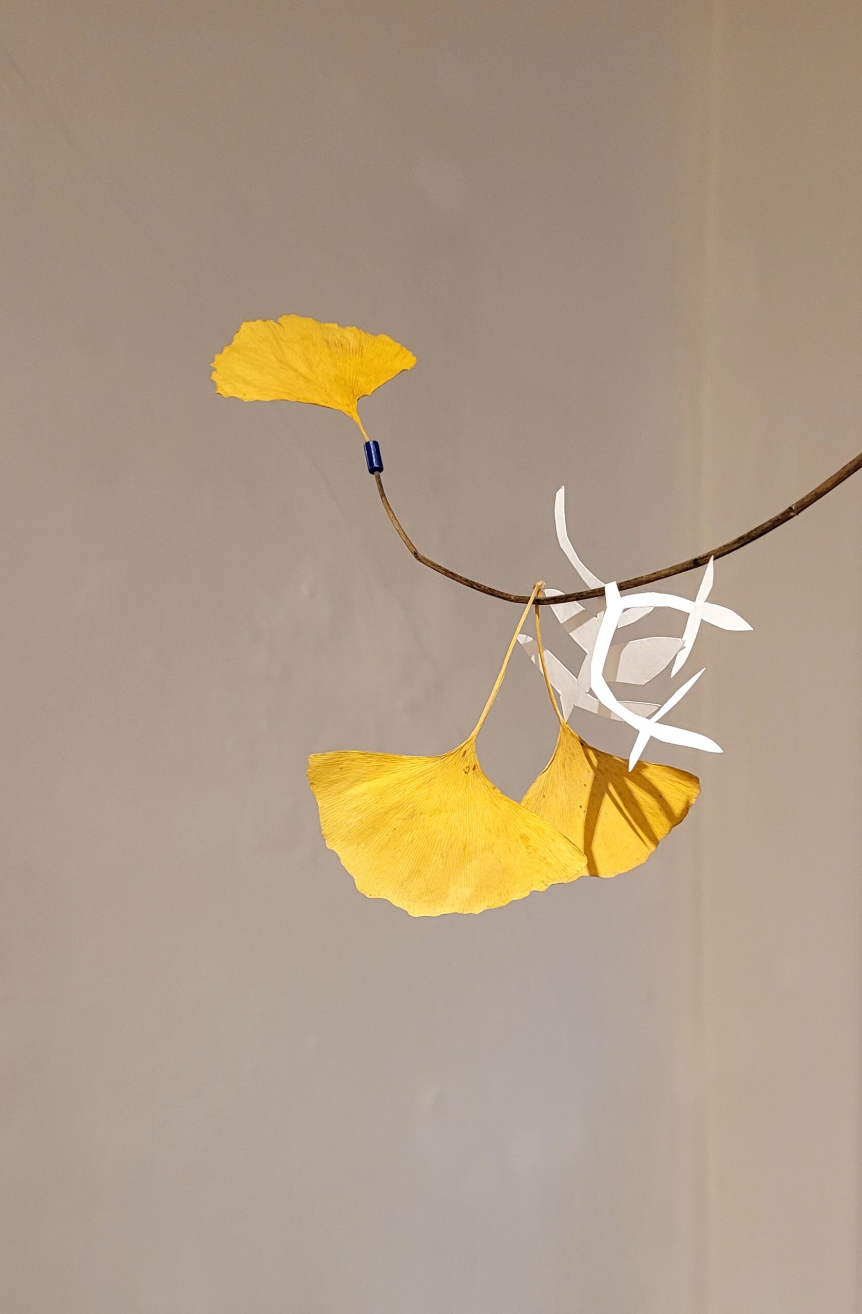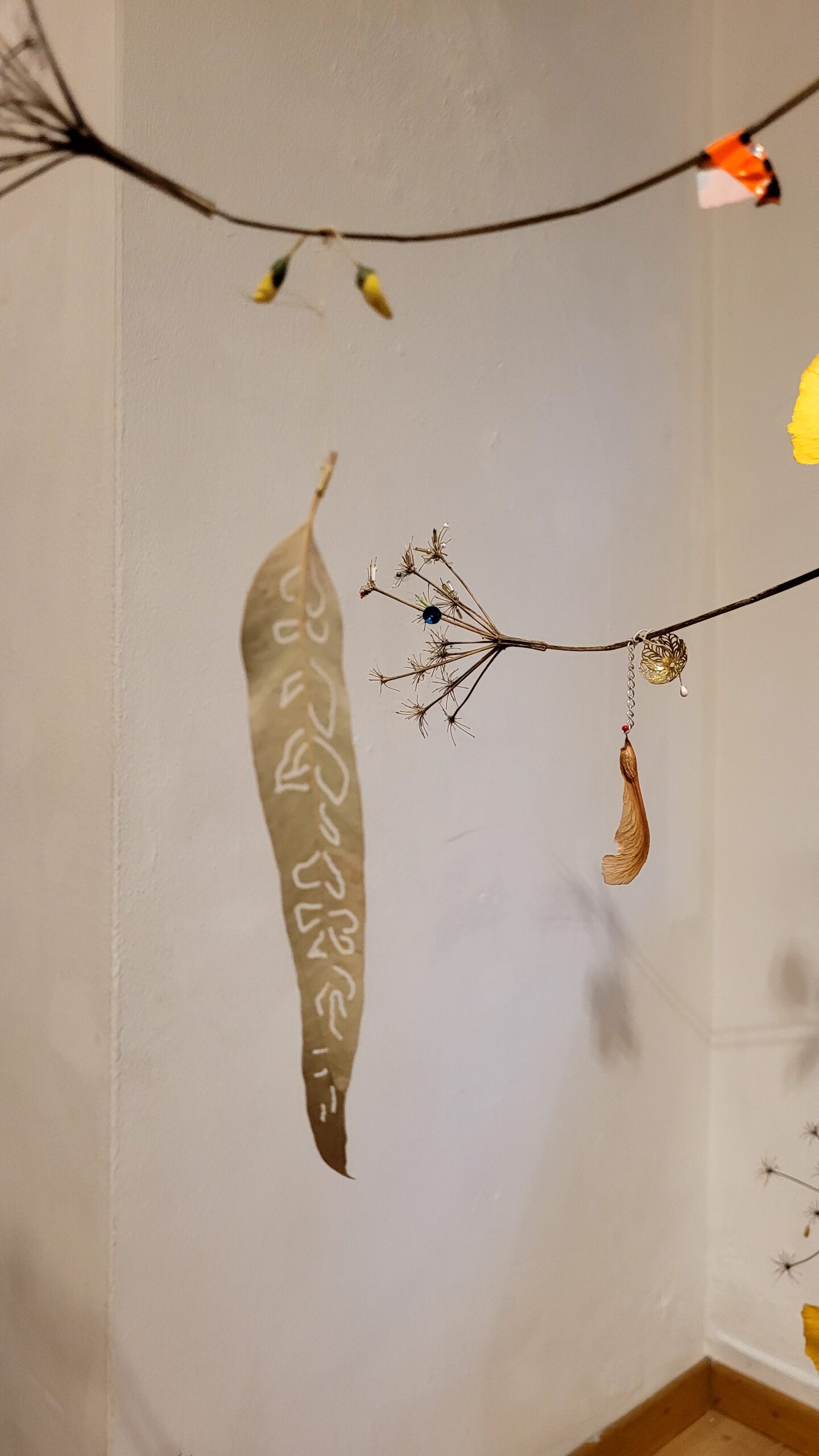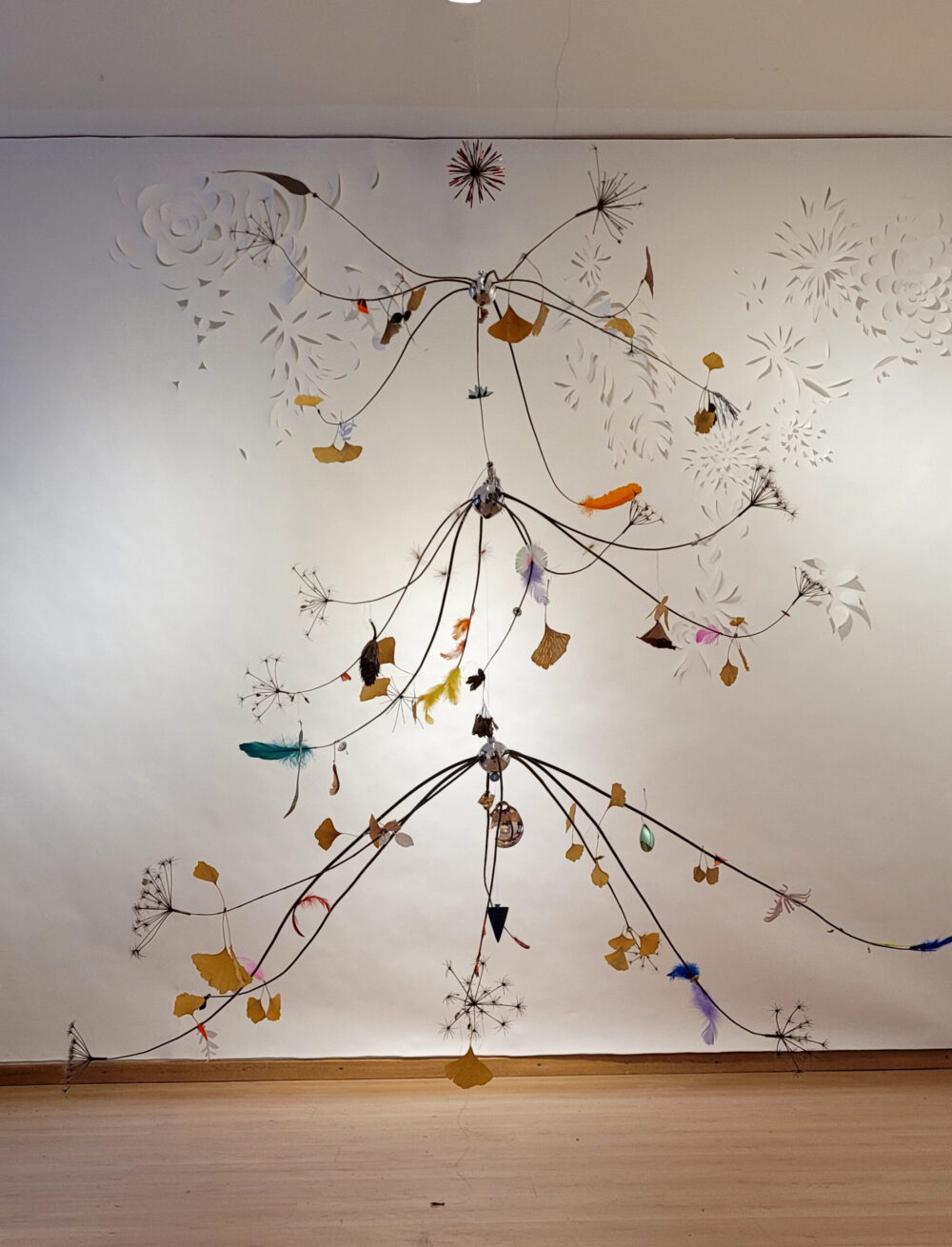 Mobile, végétaux, boules de Noël et matériaux divers