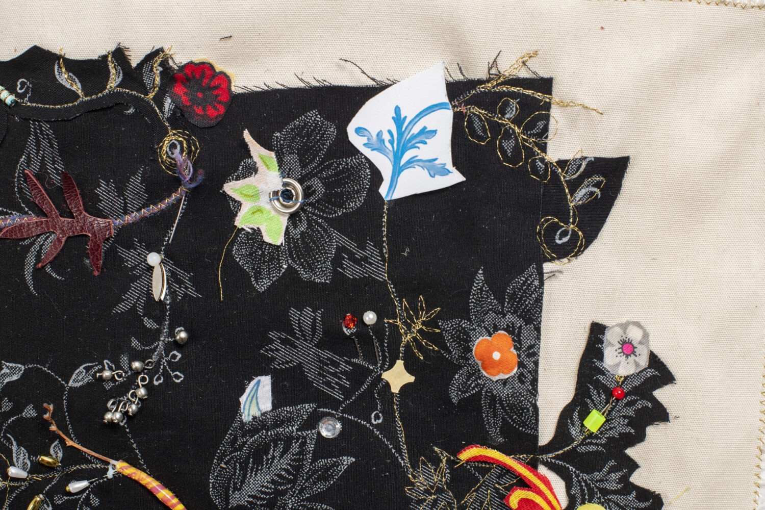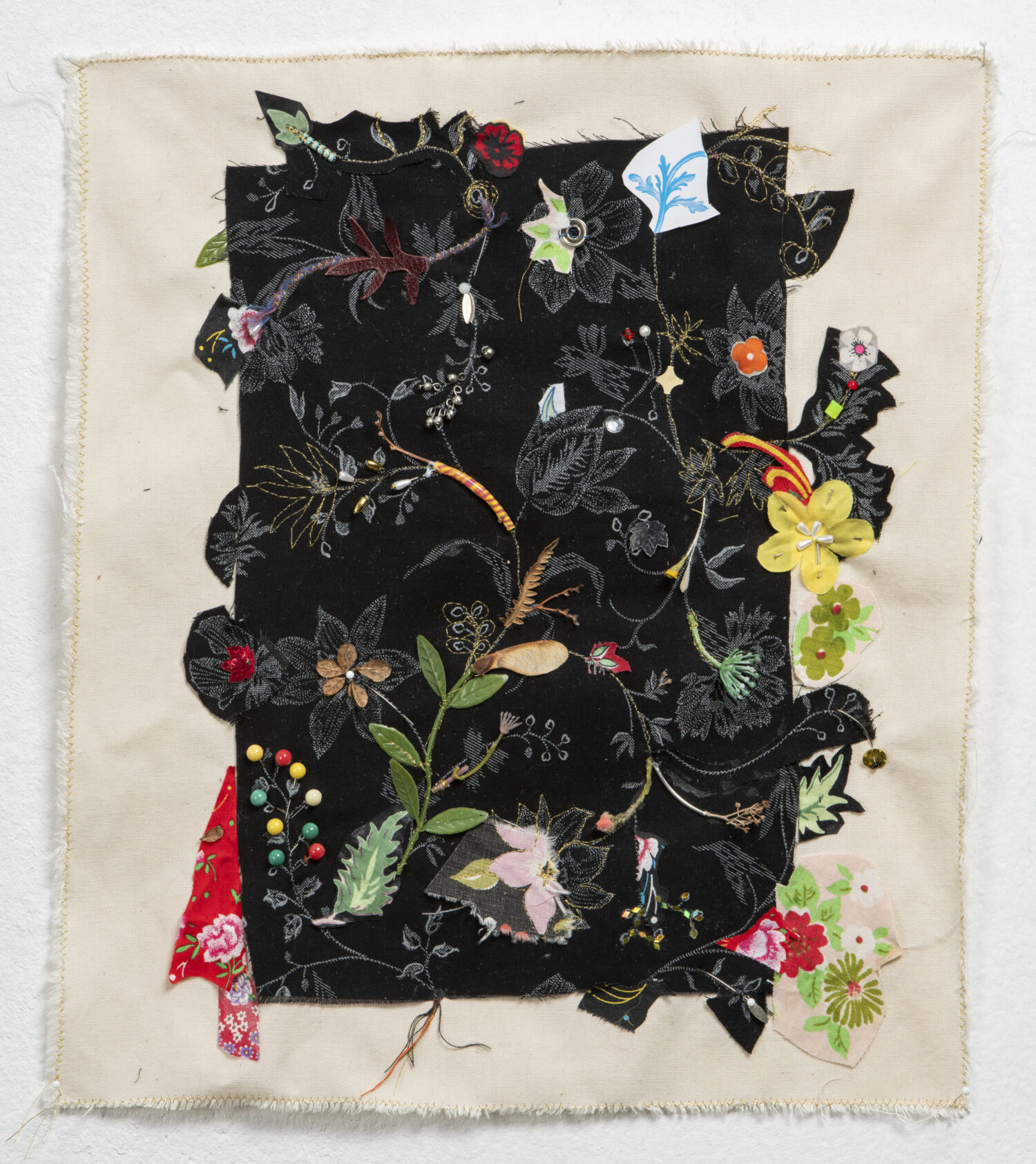 Tissus, végétaux, perles, aiguilles, plastiques